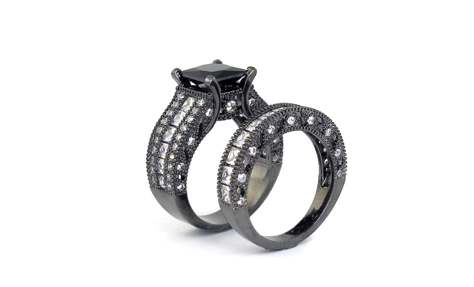 Black Rhodium Plated Bridal Ring and Band Set – Princess Cut
